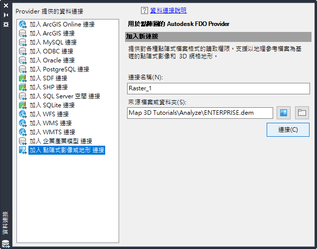 - 在「資料連接」視窗中的「Provider 提供的資料連接」下,按一下「加入點陣式影像或地形連接」,然後按一下「來源檔案或資料夾」旁邊的
