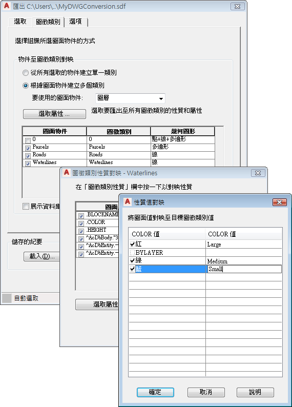 「圖徵類別」頁籤也可讓您將 AutoCAD 圖面性質對映至 SDF 圖徵類別中的性質。如果您已使用顏色、線粗或線型來表示圖層中的物件特性,則可以將這些性質對映至其所表示的特性。在此圖面中,將地圖顏色對映至水線大小。您可以將每種水線顏色對映至獨立的圖徵性質。