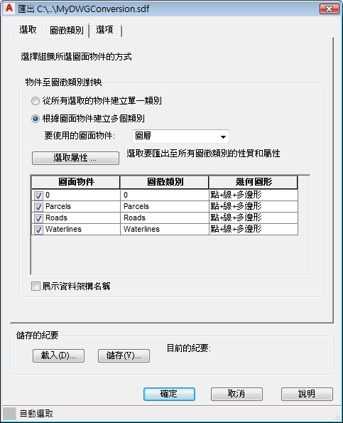 使用「圖徵類別」頁籤將每個圖層的性質對映至其在 SDF 檔案中產生的圖徵類別。您可以將某些屬性指定為共用性質:產生的所有圖徵類別都具有這些性質。例如,「線粗」和「線型」將會套用至每個圖徵類別。您可以指定特定於某個特定圖徵類別的其他屬性。例如,「地址」僅會套用至「Parcels」。