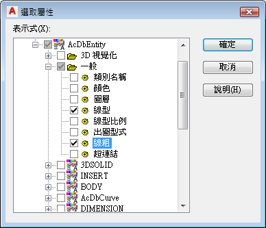 會將您於此處指定的屬性指定給 SDF 檔案中的每個圖徵類別。所以,請僅選取適合所有圖徵類別的屬性。例如,您可以選取一般性質,其中包括如線粗等的性質,但不包括特定於每個圖徵類別的物件資料性質。