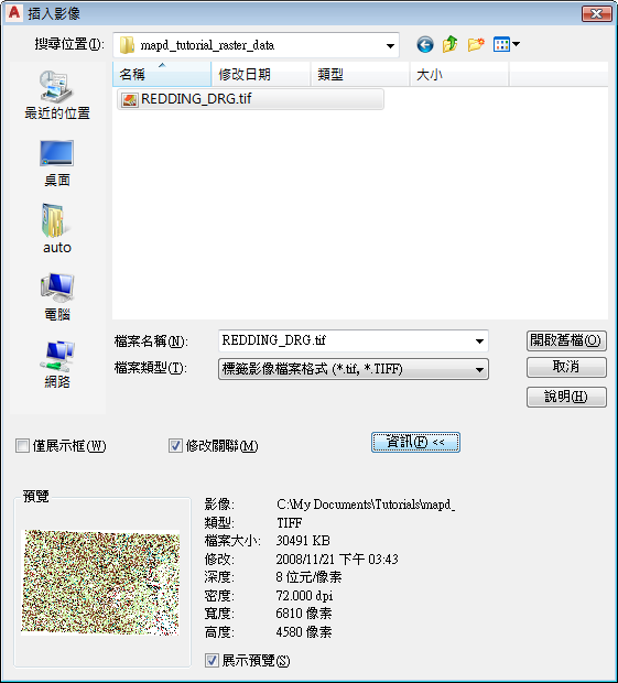 關聯來源是 World 檔案。實際檔案名為 REDDING_DRG.tfw。它儲存在您複製了自學課程範例檔案的位置。