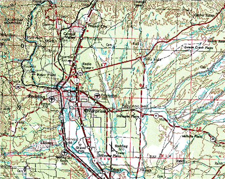 在此練習中,您會將加利福尼亞州雷丁市的一個數位點陣式圖形 (DRG) 插入到該市的圖面中。關聯的 TIFF World 檔案 (TWF) 中的資訊可讓您正確地定位影像並確定其比例。