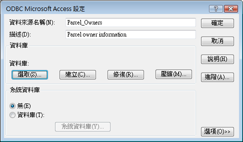 - 在「ODBC Microsoft Access 設定」對話方塊中的「資料來源名稱」中,輸入 Parcel_Owners。