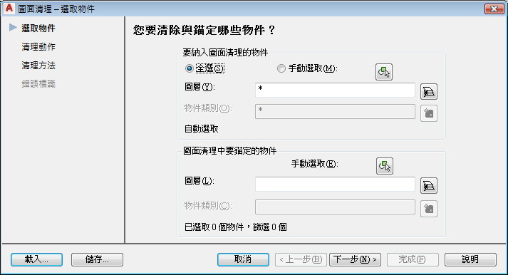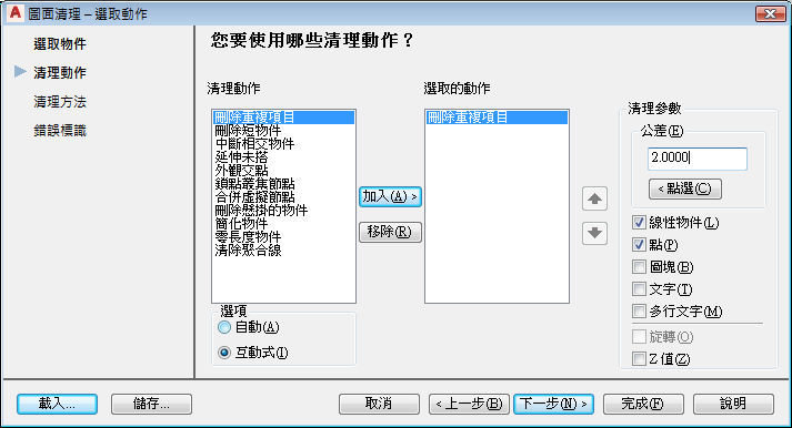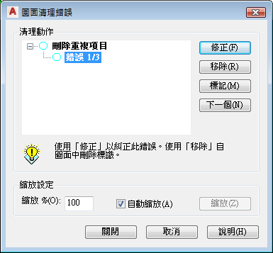 「圖面清理」會找到圖面中的錯誤,並顯示「圖面清理錯誤」對話方塊。 對話方塊會依錯誤類型群組錯誤。會亮顯「刪除重複項目」。
