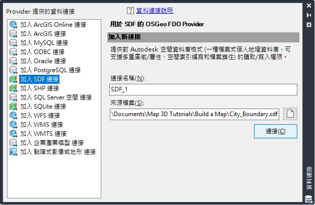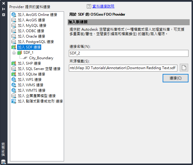 - 在「資料連接」視窗仍開啟時,在「Provider 提供的資料連接」下,再次選取「加入 SDF 連接」。