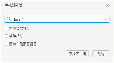 - 在「尋找圖層」對話方塊中,指定要在圖層名稱中搜尋的關鍵字,並從以下選項中選擇: