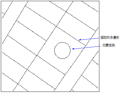會將多邊形做為真區域而不只是做為邊界來處理。在以下範例中,多邊形區域穿越了查詢邊界,因此將擷取整個多邊形,儘管組成多邊形的物件無一與查詢邊界的任何部分相交。