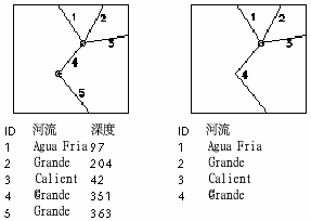 當您合併路網拓樸時,AutoCAD Map 3D 工具集 將檢查線之間的節點,以查看兩條線是否在指定的節點相交以及合併欄位是否相同。如果是,將移除節點,並且將關連兩個連結以形成一個連結。除了合併和任何新拓樸欄位之外的所有物件欄位均將被移除,如下圖所示。