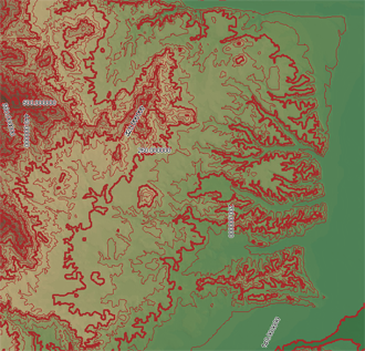 每條等高線連接的是地形上具有相等高程的點。這些線可協助您確定地形上特定位置的高程、協助明確和分析 3D 地形以及協助完成導覽之類的作業。