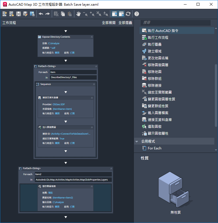 「工作流程設計器」右側的動作面板包含兩種類別的動作。AutoCAD Map 3D 工具集動作是 AutoCAD Map 3D 工具集 (包括執行 AutoCAD 指令的動作) 特有的行為。