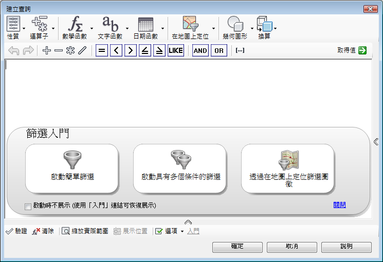 使用表示式來篩選空間資料、選取資料的子集、計算值或將資料從一種資料類型轉換為另一種資料類型。使用文字表示式來格式化文字字串以便於顯示,例如,顯示為標示。使用數值表示式來將數學函式套用至具有數值的性質。