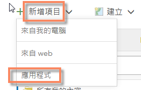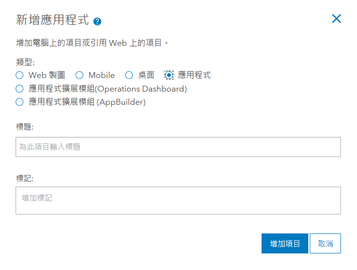 - 在「新增應用程式」對話方塊中,選取「應用程式」,然後輸入合適的標題和標籤,再按一下「加入項目」。