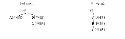 多邊形物件維護樹狀結構以追從邊界並識別巢狀層次。以下插圖展示了上面展示的兩個物件的不同樹狀結構。第一個多邊形樹包含兩個分支,而第二個多邊形樹包含一個分支。