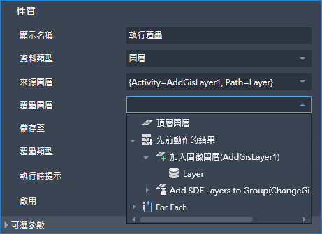 按一下右鍵後,清單會包含在邏輯上會跟隨目前動作的動作。以此方式加入動作時,可以自動將其併入您在其上按一下右鍵的動作。例如,在一個覆疊動作上按一下右鍵,然後按一下「加入圖徵圖層」,以建立一個新「顯示管理員」圖層,用於儲存覆疊作業的輸出。