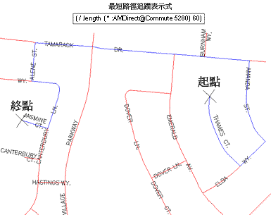 最短追蹤路徑是以阻抗 (穿越線段所花費的時間) 為基礎的。