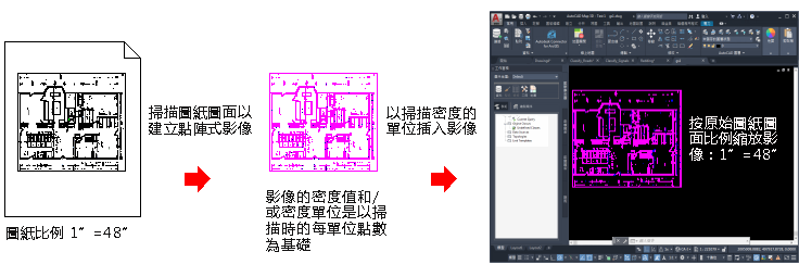 以下範例中的影像是按照 1" = 48" 的圖紙比例繪製、以每英吋 300 個點掃瞄,然後使用 300 作為密度值、「英吋」作為密度單位插入圖面的。然後,根據 1" = 48" 的圖紙比例調整它的比例。