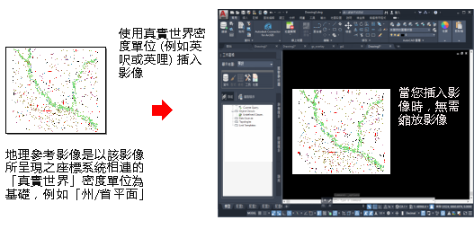 以下範例展示了密度單位與地理參考影像之間的關係。由於無需考慮圖紙比例,因此您可以使用影像表示的單位 (例如英呎或英哩) 插入影像,並且插入時無需調整影像的比例。