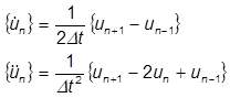 These equations can be manipulated to find expressions for velocity and acceleration at the current time increment, but expressed in terms of the displacement at past and subsequent time intervals: