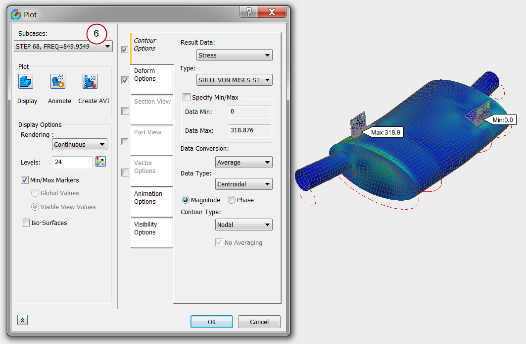 In this exercise, we shook the muffler with the road load inputs to see how much stress is expected since we still had natural frequencies in the operating range of the curve. From the resultant stress levels, we can determine if a fatigue study is required.