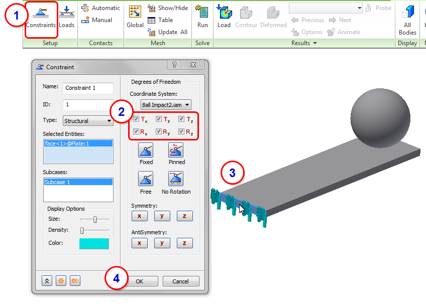 This constraint ensures the ball does not bounce sideways as a result of element face angles. Although not required for the analysis, it ensures that we get the response in the expected direction.