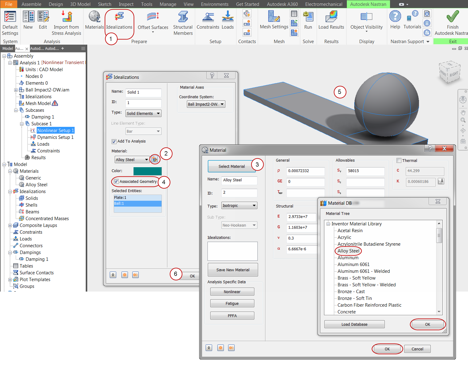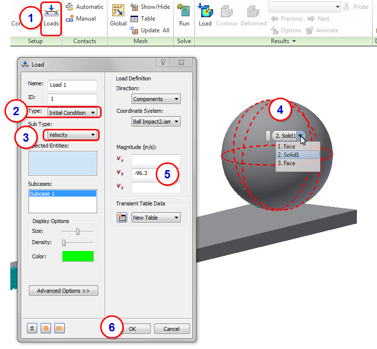 In this exercise, we will simulate a ball dropping from 12 inches onto a steel plate and rebounding back up into the air. This is an example of a nonlinear transient analysis. It requires both dynamic and nonlinear setup steps.