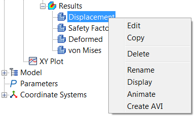 To animate the displacement, right-click on the result quantity in the Model Tree, and select Animate. To modify the animation settings, right-click on the result quantity, and select Edit.