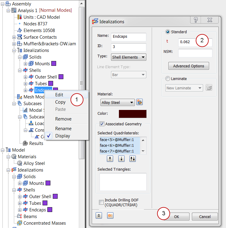 In the previous exercise, we saw that there were normal modes (natural frequencies) that corresponded to higher energy road load inputs. Ideally, the muffler should not excite at those frequencies. If we can modify the design to push the questionable modes out of the peak energy portions of the curve, we will minimize the chance that vibration-related fatigue will occur. The process of moving modes to avoid high energy or excitation frequencies is called modal avoidance.