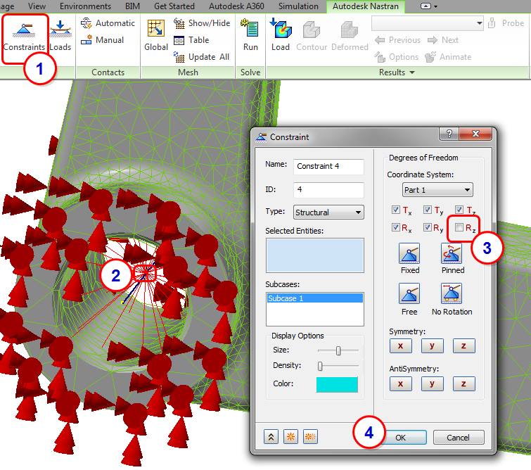 A commonly used technique in FEA is the 'ball joint' constraint to control rotations. The ball joint constraint uses rigid elements to control a reference point. The rigid elements are often called 'spokes' or 'spider webs', given their appearance. We tie the movement of an edge or surface to a reference point to allow for more natural movement. In Autodesk Inventor Nastran, this is done with a Rigid Connector: