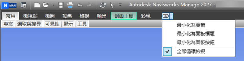 - 全部循環檢視:依順序循環檢視以下四個功能區狀態:完整功能區、最小化為面板按鈕、最小化為面板標題和最小化為頁籤。