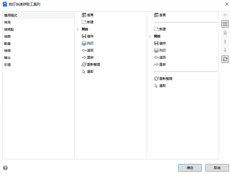 - 向上或向下移動選取的指令,以變更指令在快速存取工具列上的順序。