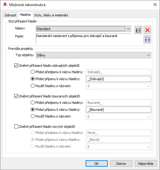 Pravidla projektu pro přiřazení hladin lze změnit podle typu objektu a kategorie. Je možné určit, že se namísto změny názvu hladiny připojí k názvu hladiny předpona nebo přípona. Tato nastavení lze uložit do stylu přiřazení hladin vybraného v dialogu Nastavení rekonstrukce.