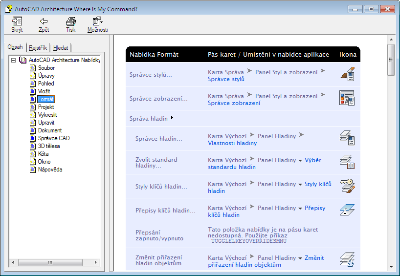 Nástroj Jak najít příkaz? lze spustit z nabídky Nápověda
