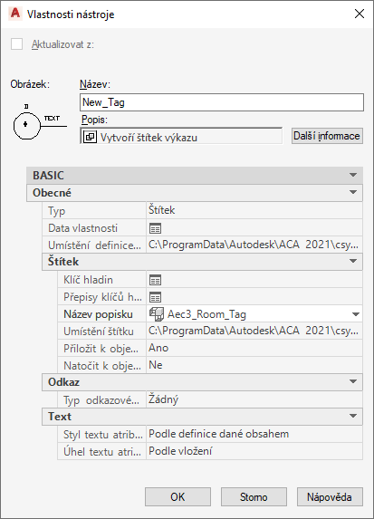 | vytvořit nástroj ze štítku výkazu ve výkresu | vyberte štítek výkazu a přetáhněte jej na paletu nástrojů. |