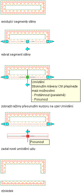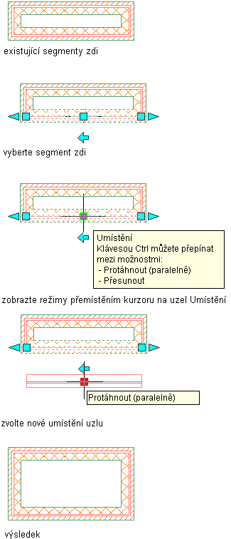 Následující obrázek znázorňuje, jak lze pomocí uzlu Umístění v režimu Protažení (paralelní) přesunout segment připojené rovnoběžné stěny se zachováním připojení přilehlých stěn.