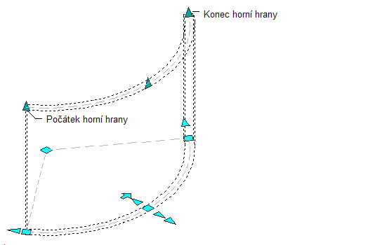 Následující obrázek znázorňuje uzly Počátek horní hrany a Konec horní hrany, které se zobrazují u segmentů zakřivených stěn v 3D a 2D pohledech.