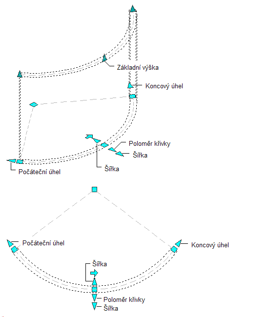 Následující obrázek znázorňuje uzly Počáteční úhel, Koncový úhel, Šířka, Poloměr oblouku a Základní výška, které se zobrazují u segmentů zakřivených stěn v 3D a 2D pohledech.