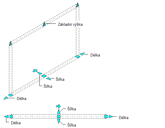 Následující obrázek znázorňuje uzly Délka, Šířka a Základní výška, které se zobrazují u segmentů přímých stěn v 3D a 2D pohledech.