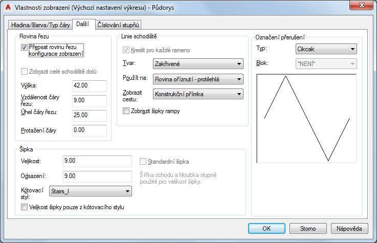 Tento postup použijte k určení dalších vlastností zobrazení pro jednotlivé schodiště, jako např. jak se zobrazí šipka v cestě, která cesta zobrazení se ukáže a jaký typ označení přerušení se má použít v zobrazení schodiště. Tyto vlastnosti zobrazení roviny řezu se vztahují jen na reprezentaci zobrazení, jako je Půdorys, která je použita v Pohled shora (půdorys) výkresu.