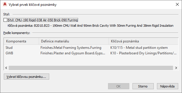 zobrazí se dialog Vybrat prvek klíčové poznámky. - Pokud chcete opatřit komponentu objektu klíčovou poznámkou, vyberte sloupec Komponenta a klikněte na tlačítko OK.