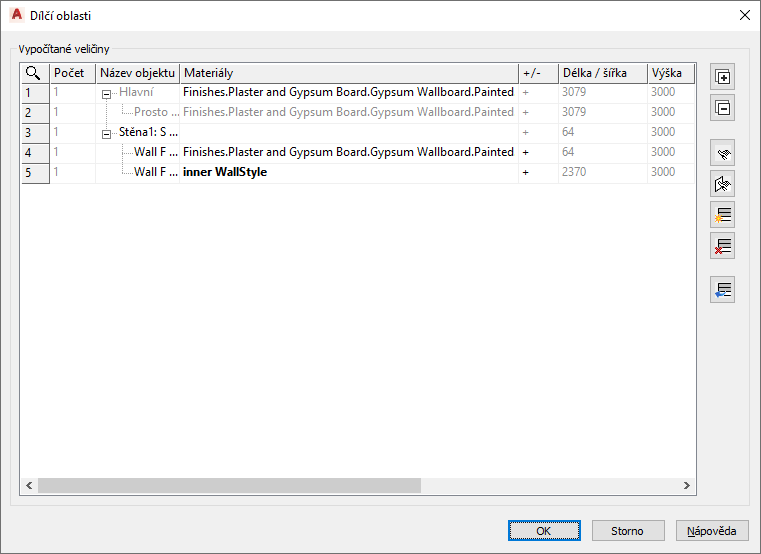 Dialog Dílčí oblasti zobrazuje seznam všech podřízených oblastí, které jsou vypočteny pro hlavní objekt. Dílčí oblasti, například otvory (okna nebo dveře) ve stěnách, jsou systémem automaticky rozpoznány a vypočítány podle pravidel definovaných v nastavení výpočtu. Dílčí oblasti lze definovat ručně (jako součet nebo rozdíl oblastí).
