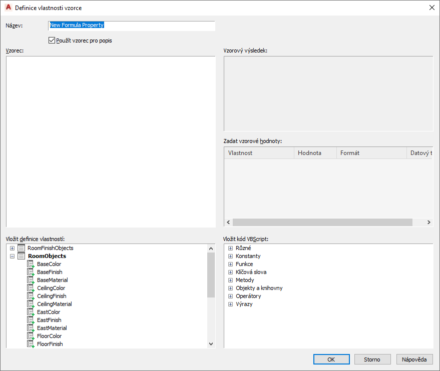 Názvy definic vlastností, použité ve vzorci, jsou zobrazeny v závorkách, například [Šířka]. Pokud definice vlastnosti náleží do jiné definice sady vlastností, než je definice obsažená ve vzorci, je tento název rovněž zobrazen, například [DoorObjects:Výška].