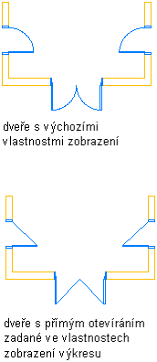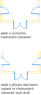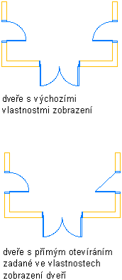 Jestliže nepoužíváte materiály k řízení zobrazení, přizpůsobte si vzhled objektu změněním jeho vlastností zobrazení pro reprezentaci zobrazení. Například, můžete vypnout otvírání dveří v zobrazení Půdorysu; určit jestli otvírání je přímé nebo obloukovité; zadat procento otevření; nebo změnit hladinu, barvu a typ čáry otvírání.