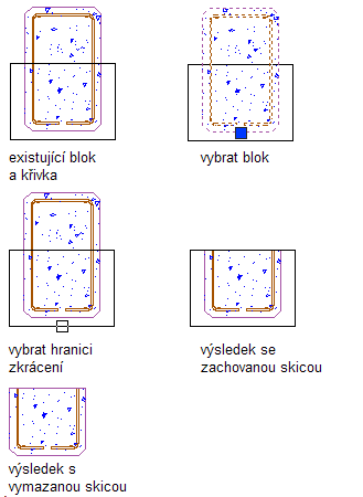 . Veškeré původně vybrané skici mimo hranice zkrácení, se smažou. Jestliže se rozhodnete smazat hranici zkrácení, hranice se překreslí pro libovolnou entitu s uzavřenými hranicemi uvnitř zkrácené oblasti, ale jakékoliv objekty s otevřenými hranicemi, které byly zkráceny, zůstanou otevřené.
