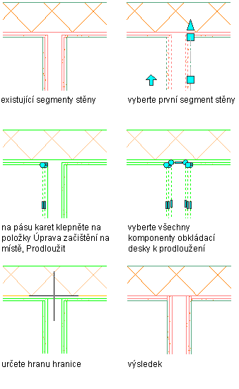 Tento postup slouží ke změně průsečíku stěny pomocí prodloužení komponenty. Hranicí prodloužení může být linie, oblouk, kružnice, křivka nebo hrana komponenty stěny.