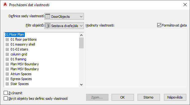 | zobrazit pouze objekty, které již mají na některé hladině připojenu vybranou sadu vlastností | zrušte zaškrtnutí políčka Skrýt objekty bez definic sady vlastností. |