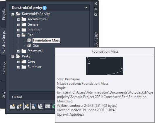 V Navigátoru projektu lze zobrazit zmenšené náhledy projektových výkresů. Náhled může obsahovat grafiku, detail nebo obojí. Zobrazení náhledů se může hodit při procházení rozsáhlého projektu s mnoha výkresy.