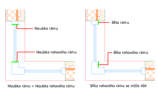 V rohovém okně se hloubka rámu a hloubka rohového rámu shodují. Šířka rámu a šířka rohového rámu se mohou lišit. Kratší strana rohového rámu slouží k určení šířky rohového rámu.