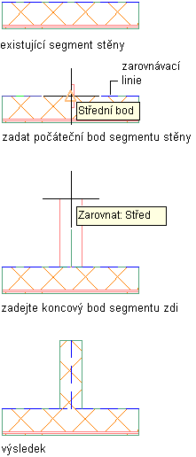 Jakmile začnete přidávat nový segment stěny, zarovnávací čára se automaticky zobrazí na existujícím segmentu stěny bez ohledu na to, zda bylo zapnuto její zobrazení. Při přesunutí ukazatele myši mimo existující segment stěny zarovnávací čára zmizí. Při výběru bodu poblíž středu segmentu stěny se na zarovnávací čáre zobrazí uchopení středového bodu. Kliknutím určete tento bod jako počáteční bod nového segmentu stěny a pak určete koncový bod tohoto segmentu stěny.