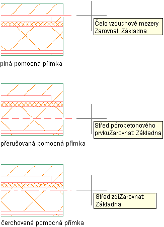 Umístění segmentu stěny změníte v průběhu jeho kreslení tak, že zadáte odsazení na základě plochy nebo středu komponenty stěny, nebo na celkovém středu stěny. Při zadání možnosti odsazení a přesunování ukazatele myši přes segment stěny se zobrazují pomocné čáry s nápovědou, které označují, jaká část konkrétní komponenty stěny je vybrána. Plná čára označuje plochu komponenty, čárkovaná čára označuje střed komponenty a osová čára označuje celkový střed stěny.