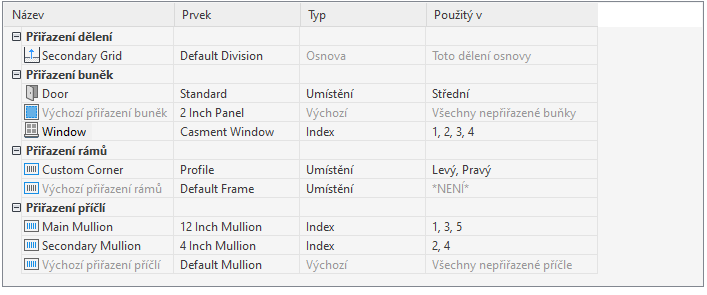 Po vytvoření definic prvků pro styl obvodového pláště, můžete tyto definice přiřadit ke každému z typů prvků obvodových plášťů: dělením, výplním buněk, rámům a příčlím.